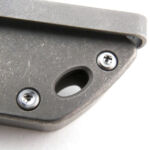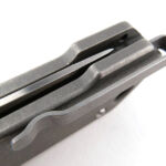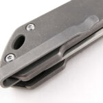 With this version, the DARK MATTER BLACK handles compliment the bronze titanium bolsters/liners perfectly. Each and every knife with this handle material is unique, and the handle scales are secured to the combined bolster and liner with three screws. A single position stainless steel wire pocket clip, can be removed if you prefer not to use it. Only one side of the pivot bolt has a torx screw head, with the other being blank. The back-spring spacer is beautifully polished giving the Jaques a very refined look. The pivot specification states ball bearings. No bearings can be seen when looking into the knife, so these covered bearings should be more dust resistant than when you can see the ball bearings themselves.