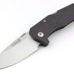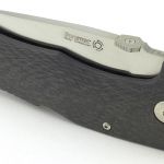 Lionsteel are a brand that stand out year-on-year thanks to maintaining a superb level of manufacturing quality over a wide range of knife designs, both fixed and folding. This review takes a look at the Carbon Fibre version of the TM1 folding knife. Like the outstanding SR-1 (which is still going strong eight years after its launch), with its impressive construction using a one-piece handle, the TM1 also uses this single-piece handle design, but instead of an integral lock it uses a more traditional back-lock. I like an integral lock as much as anyone, but I am having just a little too much of them, and find it refreshing that the TM1 uses a back-lock. One main advantage of this is that the handle shape, grip and feel is not compromised by the lock-bar. Still a heavy folder, like the SR-1, but with a very interesting reverse-tanto blade shape, and a handle with two non-metallic material choices – Carbon-Fibre or Micarta. Finding this knife was one of my show highlights from IWA 2018.