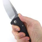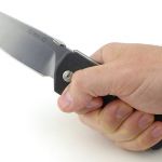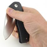 Opening is silky as the blade swings out smoothly and effortlessly on those ball bearings. If you hold the handle and push the lock bar in fully, the blade actually becomes completely free to swing (without the lock bar pressing on it) and does so with no resistance at all. Not being a flipper I had wondered if it was worth using the ball bearings, but it is – the opening is just so slick. The thumb opener has been shaped into a ramp and gives a larger contact area for your thumb than studs do, and this makes it quite a bit more comfortable to use.