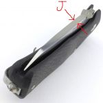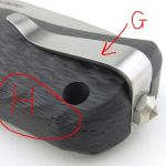 In lockback knives it is often observed when using them that there is play in the lock and/or pivot, sometimes pressing on the blade while working, the lever of the lock moves upwards. In the TM-1 there is no play in any axis. The particular architecture (D), made to high precision tolerances, eliminates the problems of the back-lock mechanism, and the presence of bearings facilitates the one hand opening normally difficult on these knives. The lock-back system (I) when well executed is a safe and efficient and durable system.