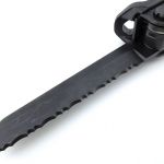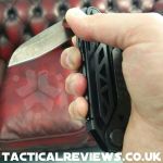 This is the first ‘reverse-tanto’ blade I’ve used, however the principle is not far from a clip-point, just a smaller clip, keeping the tip very strong. Slightly odd looking, it has proven to be highly usable. No issues with the tip’s puncturing ability even though the point angle is 71 degrees. The tip looks extremely strong, but as yet I’ve not had a reason to really put this to the test (no car doors have jumped out at me and needed cutting into).