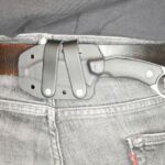 Moving swiftly to horizontal carry and suddenly everything works much better. For the leather sheath you can mount it on your hip facing backwards. The leather sheath doesn’t really work for back carry, due to the retaining strap (this is where the kydex sheath really shines).