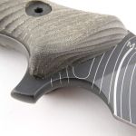 The handle is a mastery of 3D sculpting, and the milling lines in the micarta give excellent grip, adding to the already very stable hold you get from the palm swell, butt hook and finger groove. The handle is held on with 2 Allen head bolts.