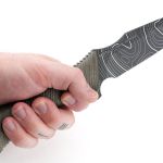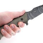 In this feature review we are looking at the blade shape with choil, in Elmax steel, Topographic blade coating pattern, with Olive handle and sheath.