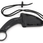 Knife retention is courtesy of the shaped lips at the mouth of the sheath that grip the front of the handle. There is sloped thumb ramp to provide leverage to push the sheath off the knife.