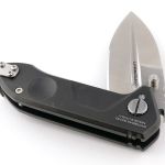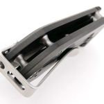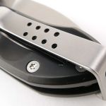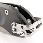Extrema Ratio folders use a pivot bolt with locking screw that prevents loosening. Unusually, the deep carry clip wraps completely over the end of the handle, fixed onto the opposite side’s handle. As it wraps over it has a slot to allow the glass breaker to protrude through the clip (this can be fitted on the opposite side).