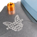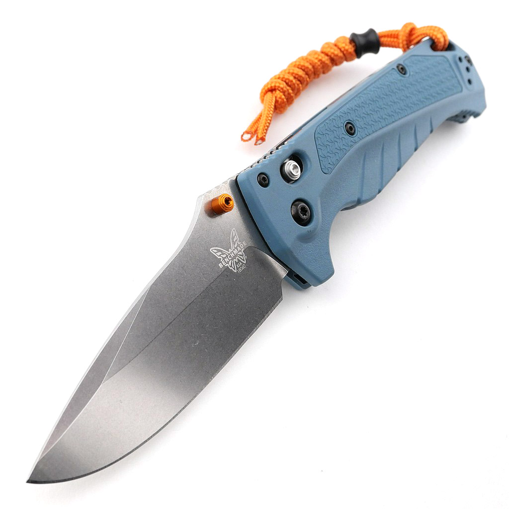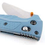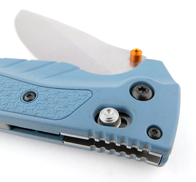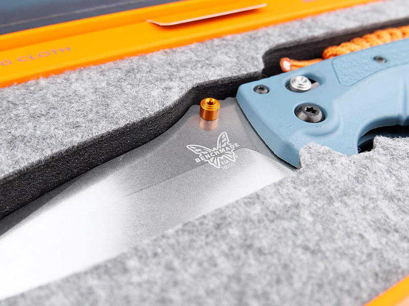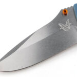 Now, with the blade open, we can get the clearest view of the phosphor-bronze washers sitting between the liners and blade tang. Renowned for its performance and corrosion resistance, CPM Magnacut is proudly emblazoned on the blade next to the Orange thumb stud. The equivalent position on the other side of the blade has the Benchmade logo and model number engraved. Taking in the whole blade, plus its spine and swedge design, and then right in to the very tip.