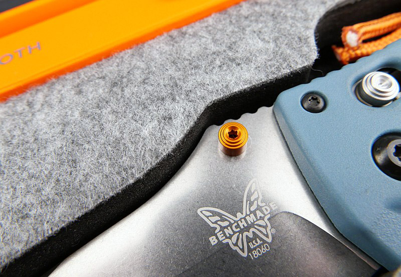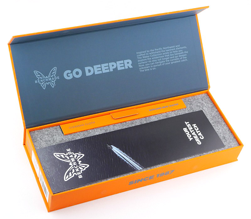 Slipping off the outer sleeve reveals the orangey glory of the main box. Flipping up the box lid shows even more layers to the packaging. The knife is presented to you with the blade open, in a felt-topped custom cut out layered box liner. Neatly stored to the back of the box is a Benchmade microfibre cloth rolled up and stored in its own section. With the knife lifted out you can see the layers of the liner, with the ‘LifeSharp’ information where the blade was sitting. All of this attention to detail certainly elevates the experience of receiving this knife.
