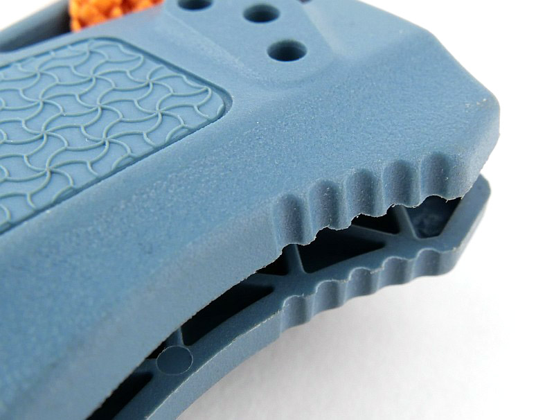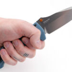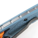 Starting with the action of the Axis lock, and once the blade is deployed, the Grivory handle’s shaping and ergonomics can really be seen. A generous integral finger guard sits to the front, ensuring your hand will not slide forward onto the blade. Grip features are incorporated all over the handle including grooves on the palm swell, and jimping near the butt.
