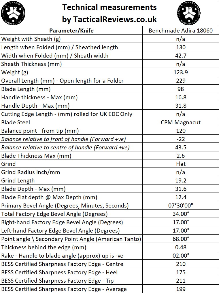 For full details of the tests and measurements carried out and an explanation of the results, see the page – Knife Technical Testing – How It’s Done.