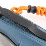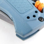 A packed gallery here, starting off with every-which-way views of the folded knife. One of the Adira’s main orange highlights is the lanyard (which can easily be removed if you don’t like them) which definitely aids grip, handling, stability and visibility. The pocket clip arrives set up for right-handed (tip-up) carry and has a mounting point on the other side for a left-handed setup. The lanyard hole is generous, taking the doubled-up paracord of the supplied lanyard easily. The anodised aluminium backspacer is a subtle, complimentary, colour to the blue handles. The stainless steel liners have thumb jimping for grip, and support the axis lock and pivot. The pivot bolt is one-sided for easy adjustment if required, but it arrives perfectly set up. There is jimping on the blade’s thumb ramp extension and at the butt of the handle. Another Orange highlight on the Adira is the double-sided thumb stud.