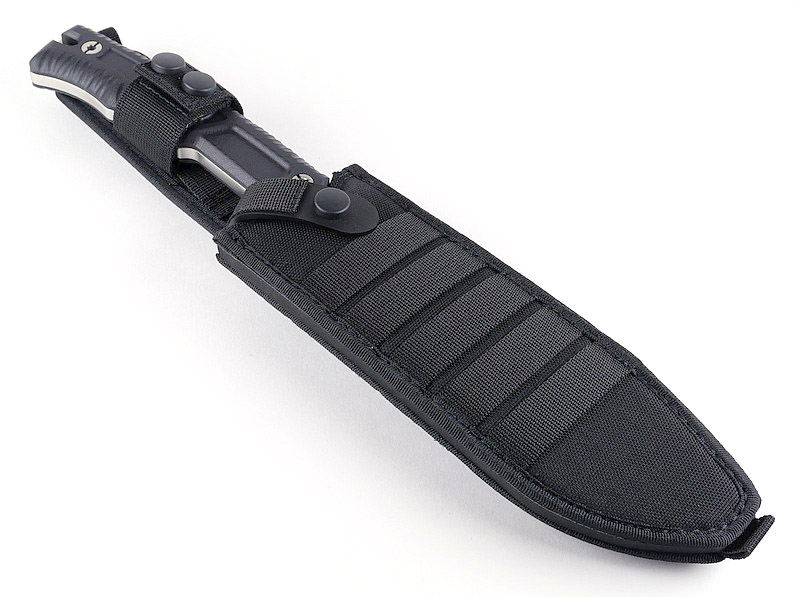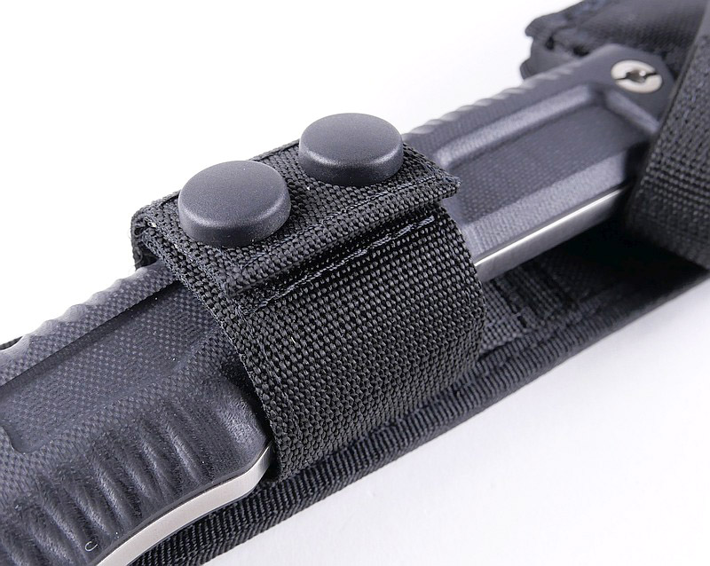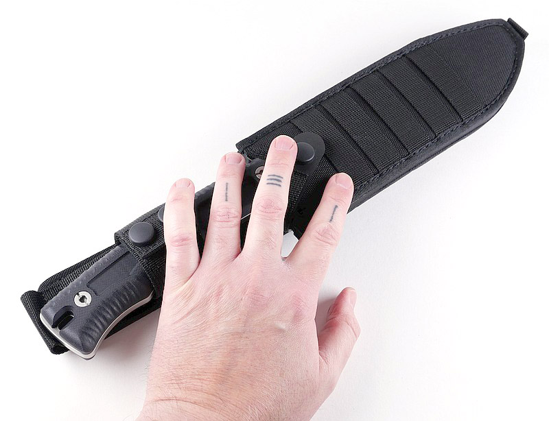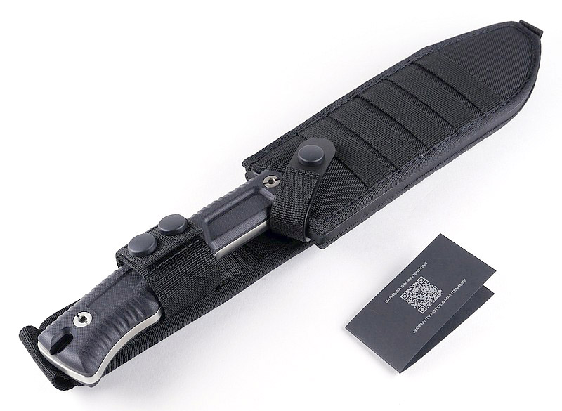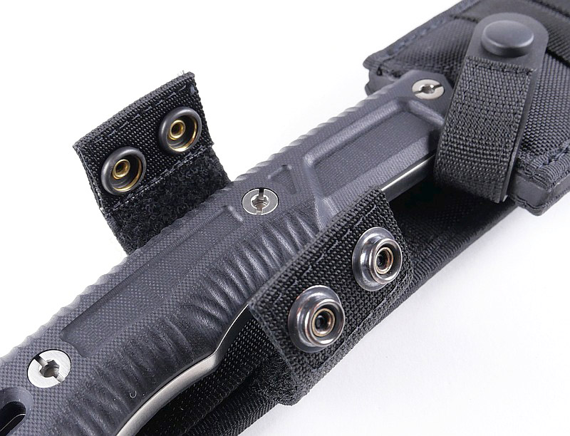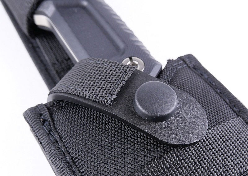 Typical for Extrema Ratio; as well as the standard retention strap, there is a handle retention strap that ensures the knife stays completely stable when not actively in use by preventing the handle flapping about, and reducing the chance of anything getting caught over the handle. This has two press studs, the inside surface of which have a plastic caps, to avoid any metal contacting the G10 handle.
