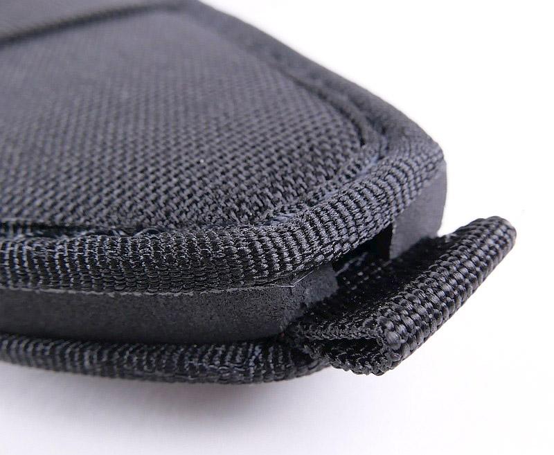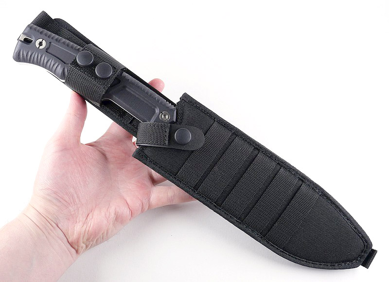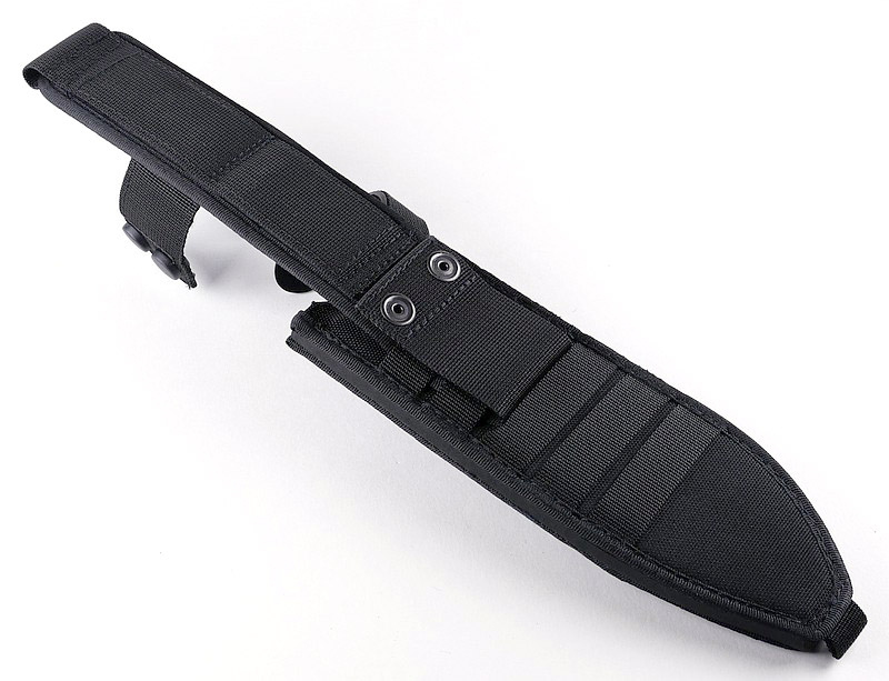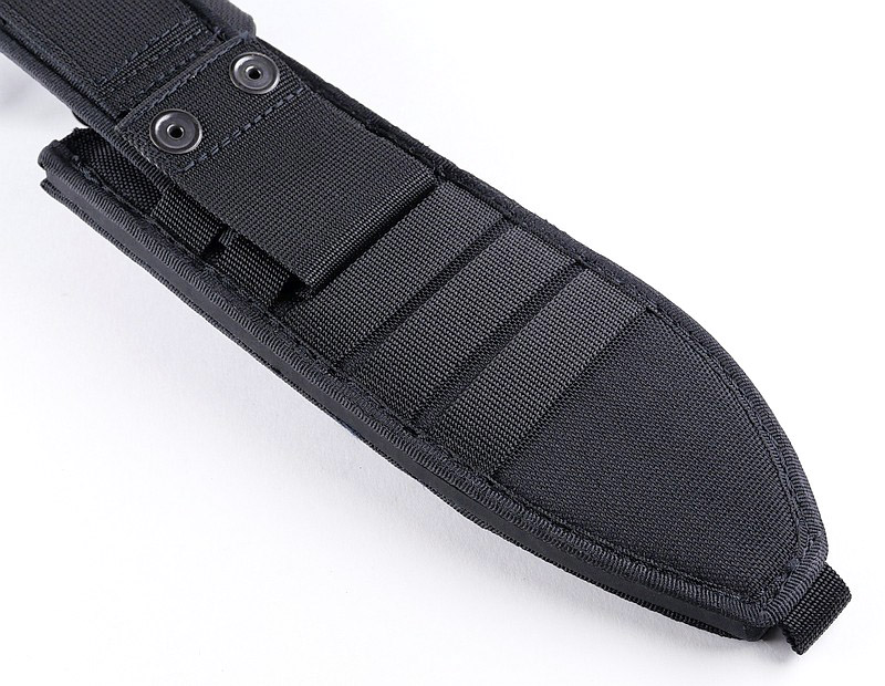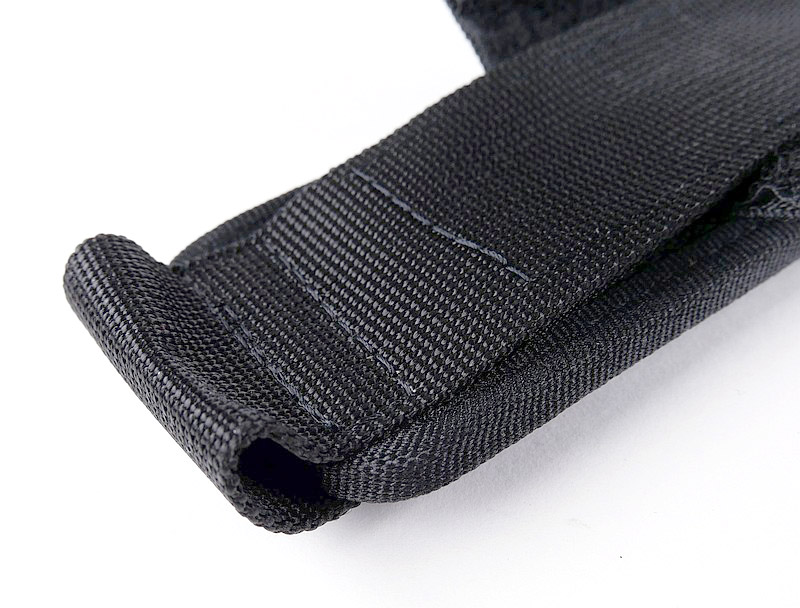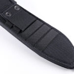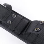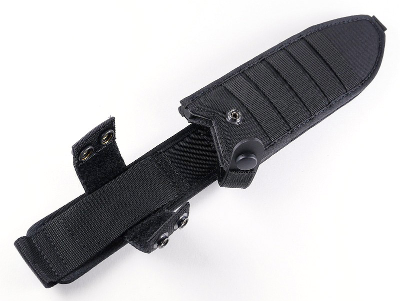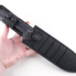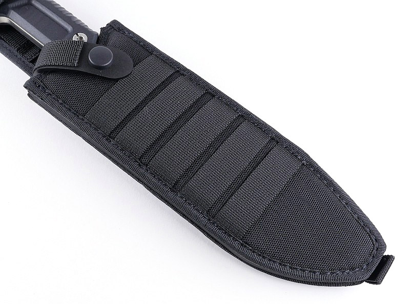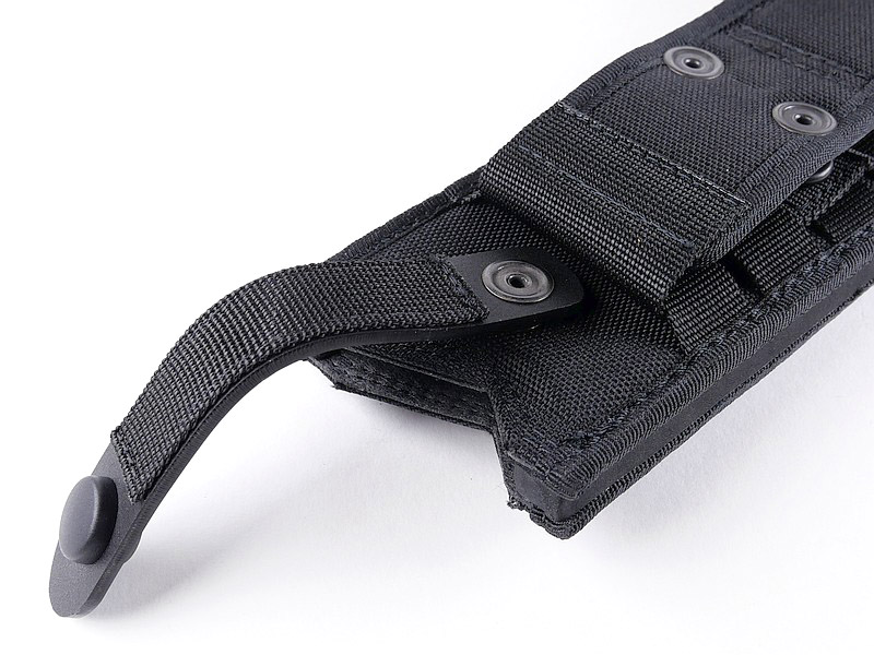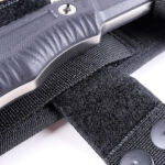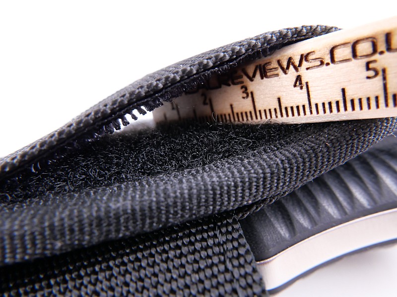 The main body of the sheath has webbing on both sides for securing the hanger and providing additional load carrying options. The tip of the sheath has a good size drainage hole next to the leg tie loop. Retention straps are always at risk of being cut when sheathing and unsheathing the knife, so to counter this Extrema Ratio have used a flexible solid plastic strip for the strap. The visible side of the strap has fabric sewn onto it to make it look completely in keeping with the rest of the sheath, but that plastic will resist cutting for a very long time, much more than a fabric strap.