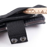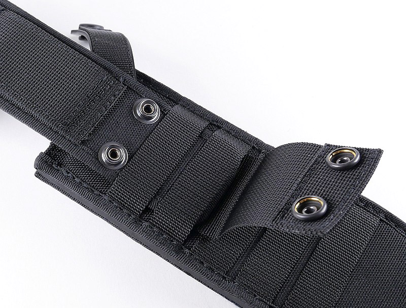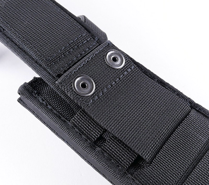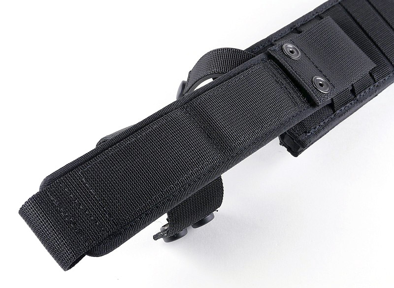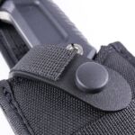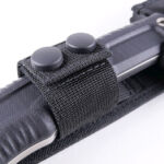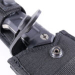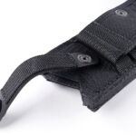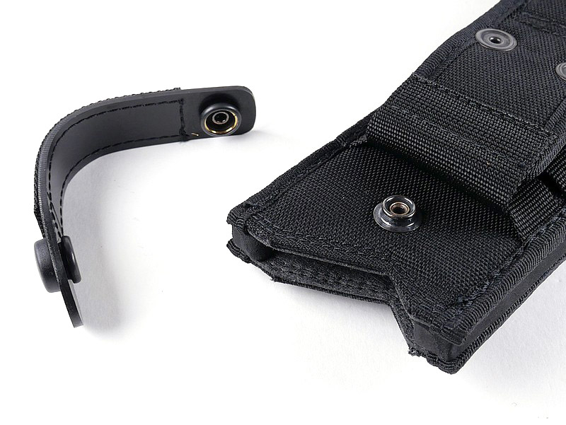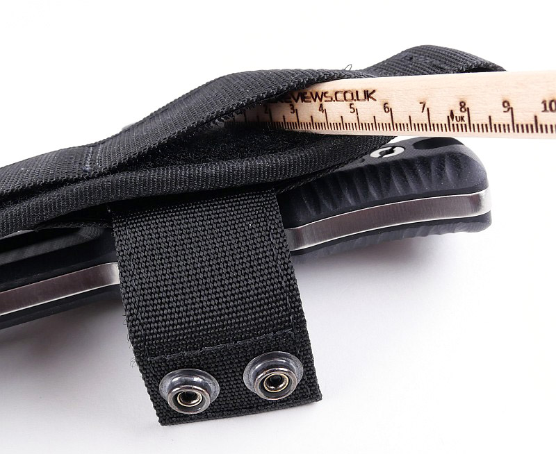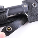 The hanger itself fits to the webbing on the sheath body using a flap with two press studs; this allows you to remove it or reposition it to suit, and to go between right and left handed configurations. Hand in hand with this, the retention strap is fitted with a press stud on both ends, so when changing handedness of the sheath, the retention strap is popped off and swapped round.