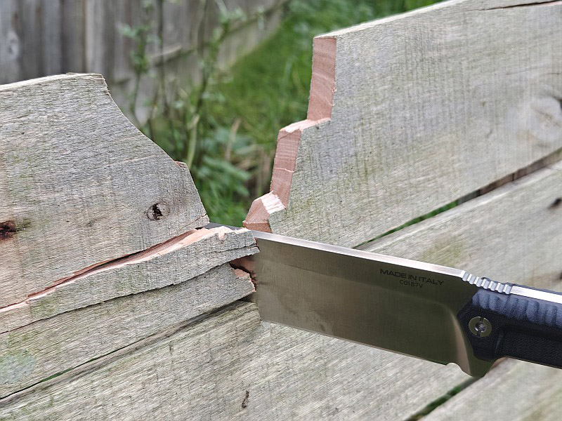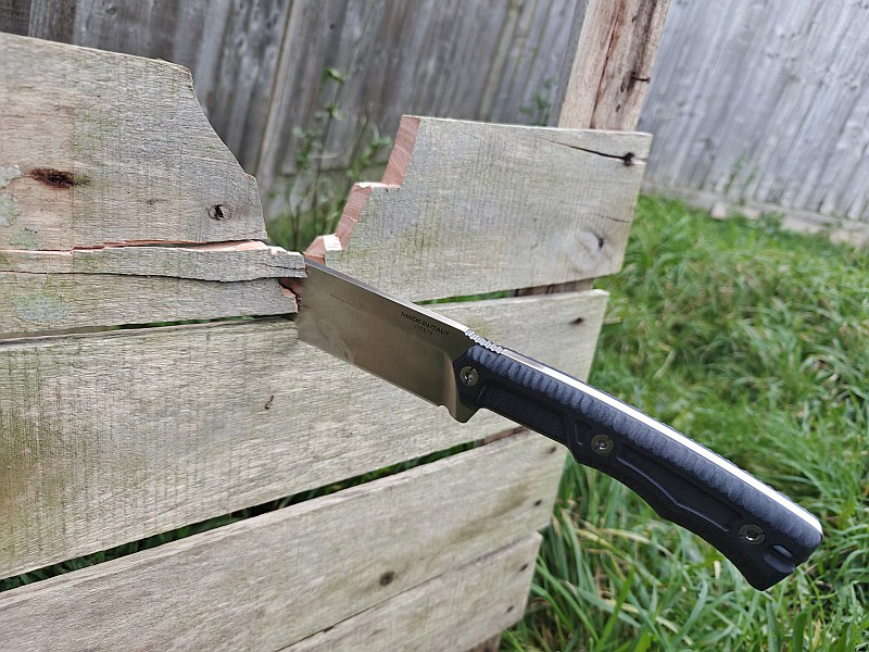 At the time of writing I didn’t have any suitable green wood for testing the chopping. Instead a trusty pallet chop test, which, as it happens, was an Italian pallet, and one made of an unknown hardwood which is well seasoned. So a suitably tough chopping test, not green wood, not softwood, but seasoned hardwood.