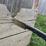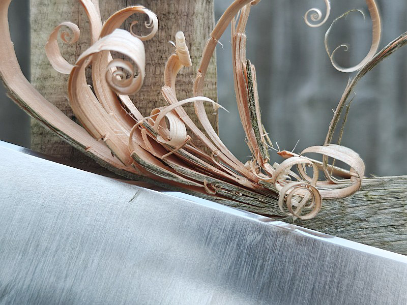 Clearly visible are the large steps in the cut from the power of the Numen’s strikes, easily finishing off the board and into the next one. Kindling and feather sticks easily processed. Despite the size of blade, I still prefer to baton kindling due to the improved control when more than one hit is required to split the wood.