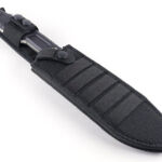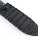 Or, “What’s in the BIG box?” as this is a substantial knife (and I may be repeating that comment a few times). Simply put it is the sheathed knife in a plastic bag along with the quality control card. Then, for scale, I’ve put my XL glove-size hand on top, which doesn’t quite do justice to the size.